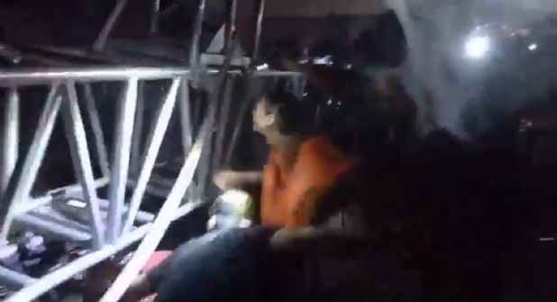 Este jueves, Jorge Álvarez Máynez, candidato a la presidencia de Movimiento Ciudadano, y Lorenia Canavati, candidata a la alcaldía de San Pedro, participaban en el cierre de campaña en el municipio sampetrino, en donde estaban otros candidatos, cuando parte del escenario les cayó encima.