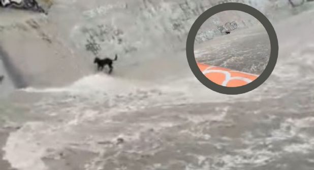 El perrito fue sorprendido por las precipitaciones mientras deambulaba por los márgenes del arroyo en busca de un lugar para ponerse a salvo.