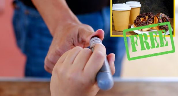 Aquí hay dos opciones: puedes elegir entre un café negro o un café con leche, pero para poder obtenerlos gratis debes mostrar tu dedo pulgar entintado.
