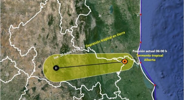 El Servicio Meteorológico Nacional informó a las 6:00 de la mañana que la Tormenta Tropical Alberto tocó tierra sobre el norte de Veracruz y mantiene su desplazamiento hacia el oeste, internándose en territortio mexicano.