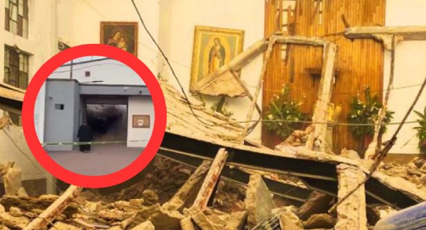 Justo cuando el techo del templo comienza a colapsar, un sacerdote se había acercado a la puerta del inmueble, para luego retirarse apresuradamente mientras todo caía.