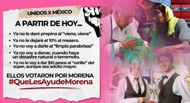 La campaña insta a no apoyar a ciertos sectores de la población, como meseros, empacadores en tiendas de autoservicio y limpiaparabrisas, bajo el argumento de que estos grupos votaron por el partido guinda, Morena.