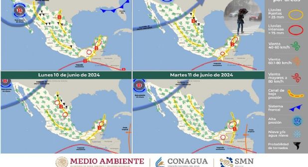 Se prevén lluvias intensas en Yucatán y Quintana Roo el lunes 10 de junio; lluvias fuertes en Chiapas y Campeche; e intervalos de chubascos para Coahuila, Nuevo León, Oaxaca, Tamaulipas y Tabasco.
