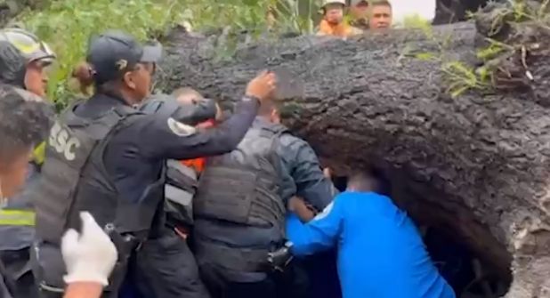 Al llegar al lugar, observaron un árbol de aproximadamente 20 metros de altura encima de un vehículo de color azul, en el cual se apreciaban persona atrapadas en su interior, por lo que rápidamente coordinaron los servicios de emergencia.