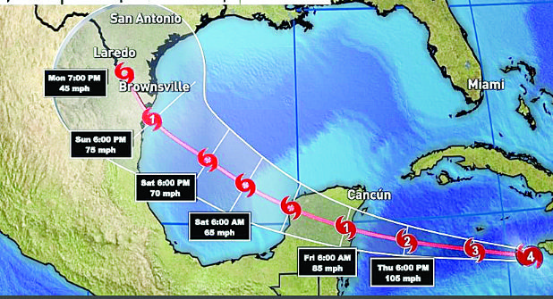 El Centro Nacional de Huracanes de Estados Unidos (NHC, por sus siglas en inglés) contempla que los remanentes del huracán Beryl, para entonces degradado a tormenta tropical, según estimaciones, podría llegar a los Laredos el lunes a las 7:00 de la tarde con vientos de 72 kilómetros por hora, pero manifestarse de manera más notoria el martes; panorama que si bien puede cambiar, mantiene su trayectoria apuntando a esta frontera, pasando por Matamoros y Reynosa.