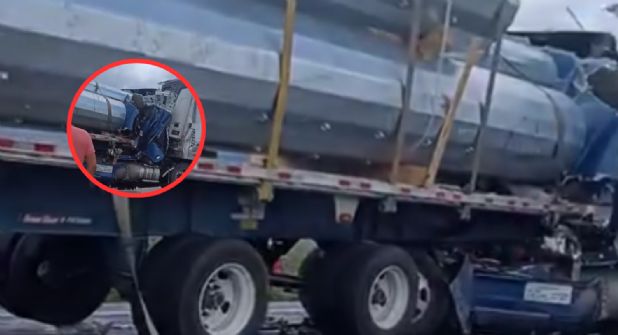 En el video de este usuario se puede ver como uno de los traileros se impacta en la parte posterior de una unidad, pero una tercera unidad se incrusta en la plataforma y su carga, tubos enormes que parecen ser un poste desarmado.