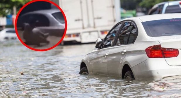 Un video circula en la red, en el cual se aprecia cómo el hombre se mete en el agua que le llega más arriba de la cintura y rompe el vidrio trasero del automóvil.