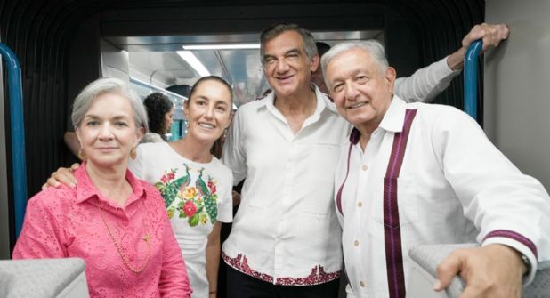 Cancun, Q.Roo.-Este tarde, el gobernador Américo Villarreal Anaya y su esposa, la doctora María de Villarreal, acompañaron al presidente Andrés Manuel López Obrador y a la presidenta electa, Claudia Sheinbaum Pardo, en su viaje en en el tren Maya, de Cancún a Chichen Itzá, donde inaugurarán un hotel del mismo nombre.