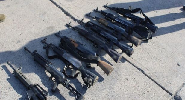 "Fueron detenidos cinco hombres, se aseguraron 15 armas largas, 110 cargadores, 6 mil 951 cartuchos, un tubo lanzagranadas, tres granadas, equipo táctico, equipos de radiocomunicación, una bolsa con mariguana, cuatro bolsas con polvo color blanco y seis vehículos, tres de ellos con blindaje artesanal", se informó.