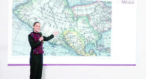 Al inicio de su conferencia, la mandataria proyectó un mapa del año 1607, en el que se mostraba el territorio de México y el sur de Estados Unidos mezclados, proponiendo nombrar de nueva cuenta a esa geografía conjunta como “América Mexicana”, haciendo alusión a iniciativa de Trump de modificar el nombre de la cuenca oceánica que comparten ambos países a “Golfo de América”.