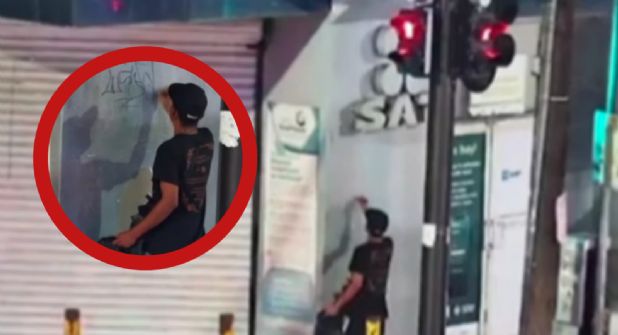 En el clip, se puede apreciar como el joven saca un plumón, y realiza pintas estilo “graffiti” sobre la pared del edificio de la institución pública.