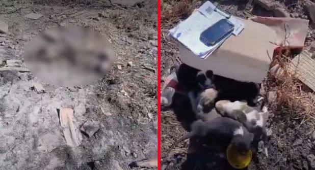 Al acercarse, la mujer encontró a seis perritos abandonados, deshidratados y llorando sin consuelo. Pero lo más desgarrador fue el hallazgo que vino después: