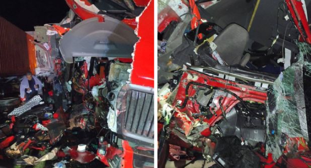 Circularon varias fotografías en las que se percibe que un tráiler con su cabina en color rojo quedó hecho pedazos, por lo que se desconoce el estado de salud del conductor.
