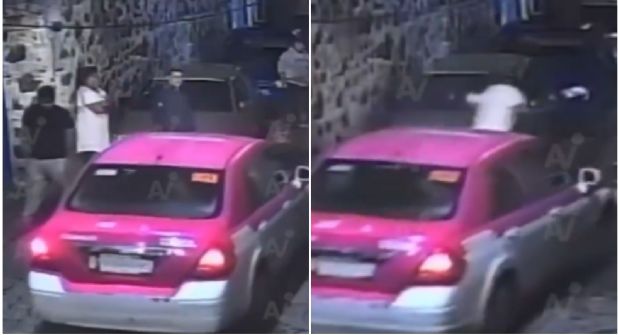 El taxista finalmente retrocede y embiste a dos personas. Debido a lo estrecha que es la calle, los vecinos no pudieron huir y fueron arrastrados por el taxi por varios metros. Otra cámara de videovigilancia ve cómo impactan contra el suelo. Ambas víctimas están en tratamiento médico y se trata de un matrimonio; una de ellas en estado delicado.