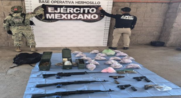 -En Hermosillo, elementos del Ejército Mexicano y Fiscalía Estatal catearon un inmueble, aseguraron tres armas largas, cuatro armas cortas, tres cargadores, 981 cartuchos, diversas dosis de drogas y dos vehículos con reporte de robo.