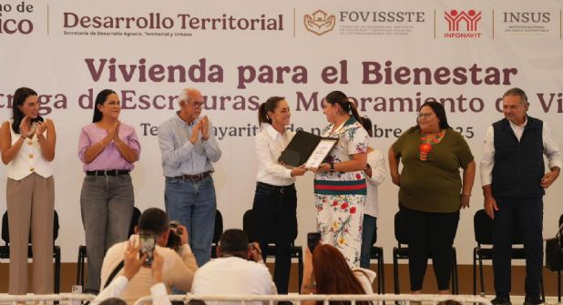 En Tepic, Nayarit, la presidenta de México Claudia Sheinbaum Pardo realizó, como parte del programa Vivienda para el Bienestar, la entrega de 510 escrituras y constancias de reducción, como un acto de justicia ante los créditos impagables que en la época neoliberal se imponían para obtener una vivienda y lo cual cambió con la llegada de la Cuarta Transformación.