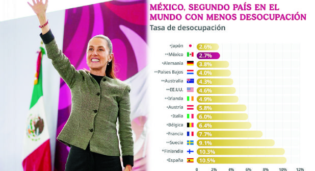 La presidenta de México Claudia Sheinbaum Pardo informó ayer que el país cerrará el año con una de las tasas de desempleo más bajas a nivel global, una cifra que atribuyó directamente a las políticas económicas y sociales de su administración.