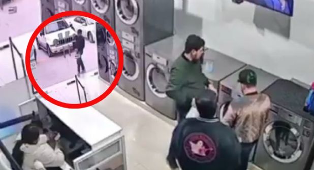 Las cámaras de videovigilancia capturaron a los tres muchachos llevando a cabo sus labores de limpieza de manera cotidiana, a la vista de una trabajadora que supervisa las lavadoras. En un momento dado, un tipo vestido de negro se acerca al comercio y antes de ingresar corta cartucho.
