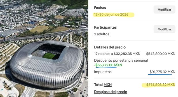 Sin embargo, en junio del 2026 los precios cambian. El primer partido del Mundial es el domingo 14, pero se puso como día de llegada al edificio el sábado 13 y salida el martes 30, un día después del último partido en el Estadio Monterrey.