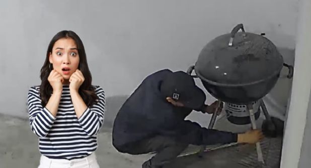 En el video se aprecia como el ratero camina hacia el asador, el cual se encontraba en lo que parece ser una cochera, y sin titubear, se coloca en cuclillas para cargar el objeto y huir con él.