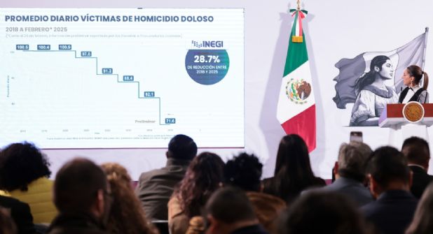 La Presidenta de México, Claudia Sheinbaum Pardo, destacó que de acuerdo con datos preliminares, del 2018 al 24 de febrero de 2025, se ha logrado una reducción del 28.7% en el promedio diario de víctimas de homicidio doloso en el país.