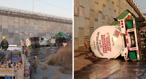 De acuerdo con las autoridades, el conductor de la pipa circulaba a exceso de velocidad y perdió el control del vehículo en plena carretera lo que lo llevó a volcar.