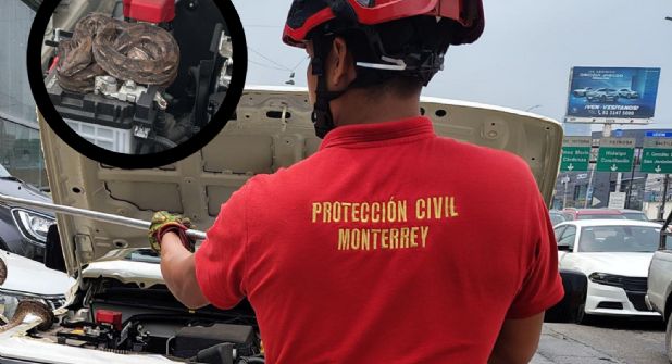 Arriba de la batería de un auto nuevo de agencia en Monterrey fue hallada una imponente serpiente; los empleados se sorprendieron al abrir el cofre de una camioneta Jepp blanca y ver a una enorme pitón.