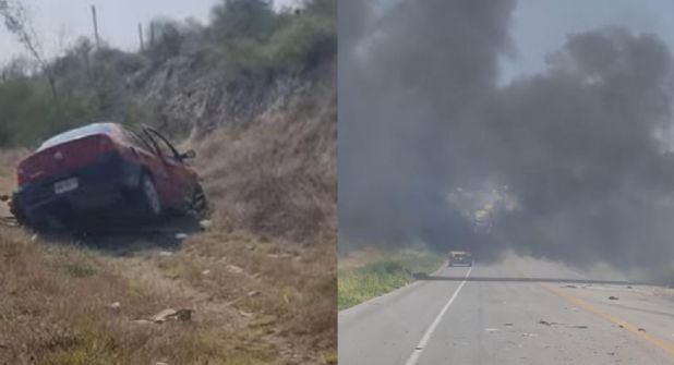 De acuerdo con reportes de medios locales, el tráiler se incendió tras chocar contra el auto particular. Se quemó la carga que llevaba, que para infortunio era cargo, por lo que aún se propagaron más las llamas. Por si fuera poco, esto ocurrió cerca de un pastizal, por lo que el fuego avanzó aún más.