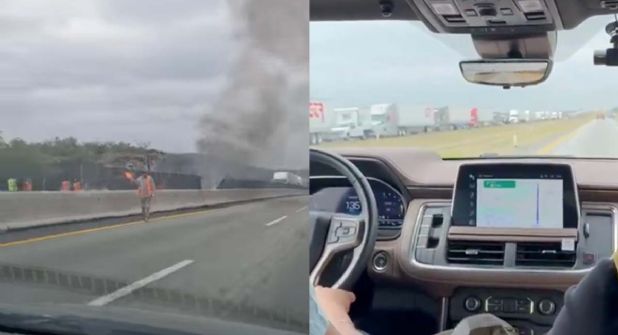 Al parecer, un tráiler que se dirigía hacia el norte se accidentó y a su vez se incendió, lo que provocó un gran incendio. Se desconoce si el chofer que viajaba en el tráiler salió con vida, pues solo se ve que la caja del camión quedó completamente calcinada, así como la cabina del chofer.