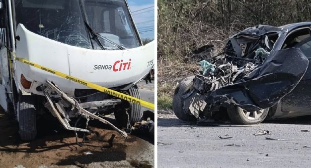 El conductor de un Nissan Versa color negro, placas RUX-776-B, chocó de frente con un camión de transporte de personal de Senda, y murió instantáneamente, al igual que su hijo, un menor de entre 9 y 7 años de edad.