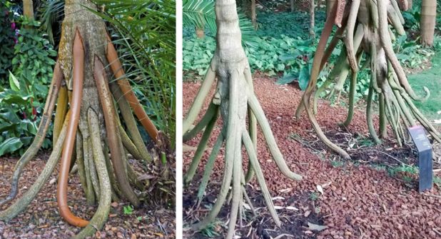 Aun cuando su apariencia parezca sugerir otra cosa, la Socratea exorrhiza echa raíces profundas que con una nueva posición sugiere esa ilusión de haber "caminado" y moverse de lugar.