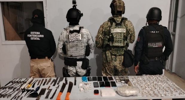 En Centro, elementos de GN, Ejército Mexicano, Policía Estatal y del Sistema de Administración Penitenciario, realizaron una inspección al Centro de Reinserción Social del estado y aseguraron dos armas cortas, dos cargadores, ocho cartuchos, 19 armas blancas, 705 dosis de marihuana, nueve celulares, seis básculas digitales, una batería portátil, seis cargadores para celular, tres tarjetas chip para celular, dos módems, tres tijeras y una barra metálica.