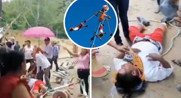 Un fuerte accidente sufrieron un grupo de voladores de Papantla, quienes al estar realizando un ritual cayeron de una altura superior a los 10 metros tras el colapso del poste que los sostenía.