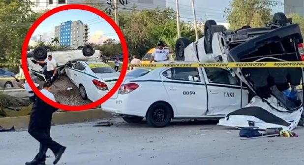 La unidad de gran tamaño perdió el control y se volcó, impactándose contra un taxi del sindicato Andrés Quintana Roo, con número económico 0059.