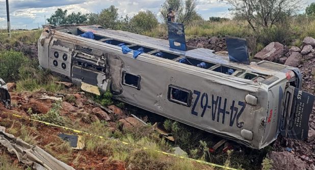 Los primeros reportes de las autoridades señalan que el conductor circulaba a exceso de velocidad y eso provocó que el autobús saliera del camino y terminara volcado en medio de los dos sentidos.