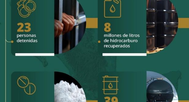 En San Fernando, Tamaulipas, como parte de la Estrategia para combatir el Robo de Hidrocarburo, elementos de GN, Ejército Mexicano, Instituto Nacional de Migración (INM) y Logística de PEMEX detuvieron a un hombre con documentos de carga irregulares, aseguraron un tractocamión, dos autotanques y 67,000 Litros de hidrocarburo.