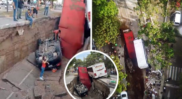 Las autoridades mencionaron que cerca de las 18:00 horas fueron notificadas sobre un fuerte accidente en el que se habían visto involucrados varios automóviles, pero al llegar al lugar se encontraron con parte de un tráiler dentro de un enorme hoyo, además, un camión de transporte público también estaba a punto de caer y en el fondo de la zanja se encontraba un vehículo particular con las llantas hacia arriba.