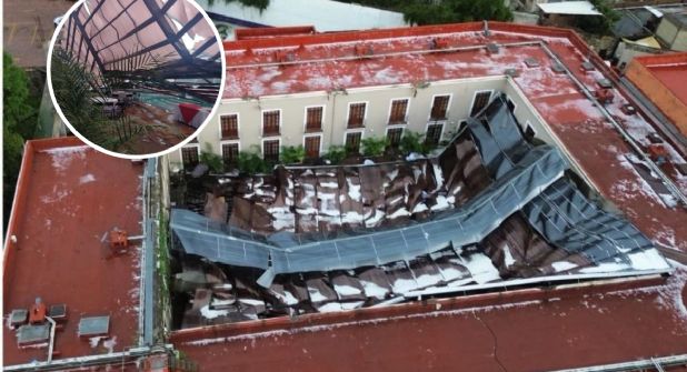 Las autoridades de Protección Civil del Estado confirmaron que debido al peso del granizo que cayó esta tarde, el techo de la zona de la alberca se vino abajo, por lo que la zona del Hotel San Francisco fue acordonada y revisan las instalaciones del lugar.