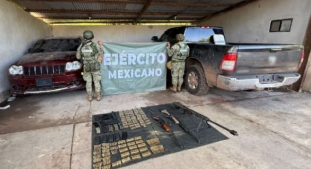 En Moris, elementos del Ejército Mexicano aseguraron un fusil Barrett, dos armas largas, cargadores, cartuchos y dos vehículos.