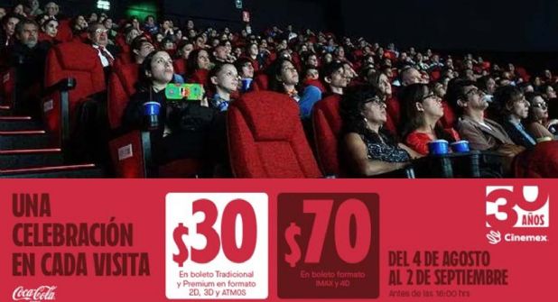 Durante agosto se conmemoran los 30 años de Cinemex en México, por lo que la marca está de fiesta y compartirá las promociones con todos los amantes del cine. La compañía es de las más reconocidas en el país, se espera que con los descuentos las alas luzcan llenas y seguir siendo de las preferidas por los mexicanos.