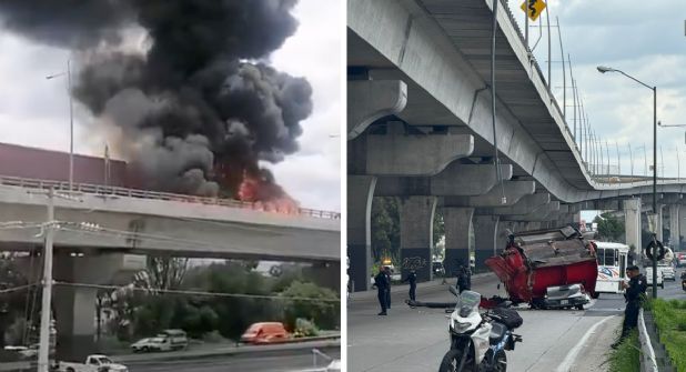 Un camión con refrescos se vio envuelto en llamas y parte de su contenedor cayó de una altura superior a los 10 metros, aplastando una camioneta y provocando la muerte de dos policías.