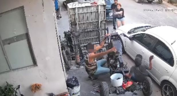 En el video se observa cuando dos hombres estaban sobre una banqueta, afuera de un taller mecánico, arreglando una trimoto. De repente se acercaron una joven mujer, de cabello recogido, short y playera negra, y preguntó si sabían en dónde se encontraba una tienda.