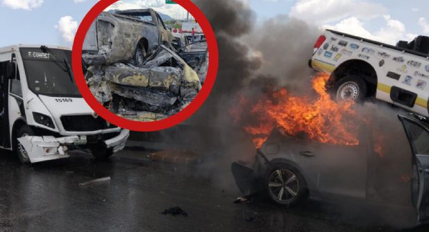 De acuerdo a la información recabada en el lugar de los hechos, tras la colisión una camioneta quedó sobre el techo de dos automóviles los cuales comenzaron a incendiarse rápidamente ante la mirada de los conductores que se encontraban en el área.