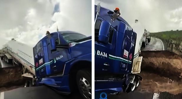 Durante el paso de la pesada unidad, la plataforma de asfalto cedió, dejando la cisterna pendiendo peligrosamente mientras transportaba combustible altamente inflamable. El escenario encendió las alarmas por la posibilidad de una fuga o explosión.