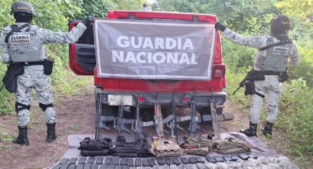 En Culiacán, en el poblado Los Mayos, elementos de GN localizaron un vehículo, aseguraron siete armas largas, 63 cargadores, 1,744 cartuchos, cinco chalecos tácticos y 10 placas balísticas.