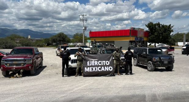 En Jaumave, elementos del Ejército Mexicano y Policía Estatal aseguraron seis vehículos con reporte de robo y blindaje artesanal, un arma larga, cargadores, 151 cartuchos, 19 chalecos tácticos y ocho equipos de radiocomunicación.