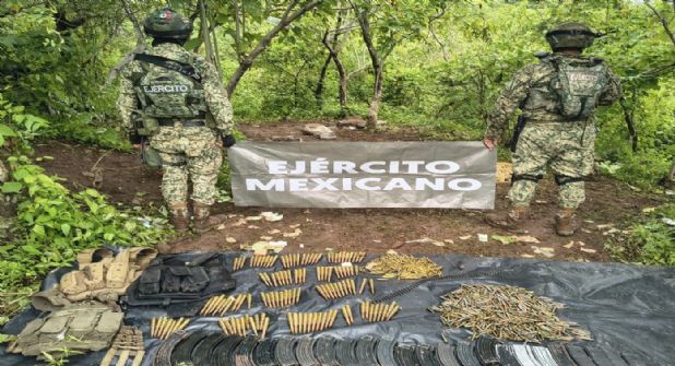 En Culiacán, en la comunidad El Tepuche, elementos del Ejército Mexicano localizaron un área de concentración, aseguraron cuatro armas largas, 31 cargadores, 6,145 cartuchos, cuatro chalecos tácticos y 23 placas balísticas.