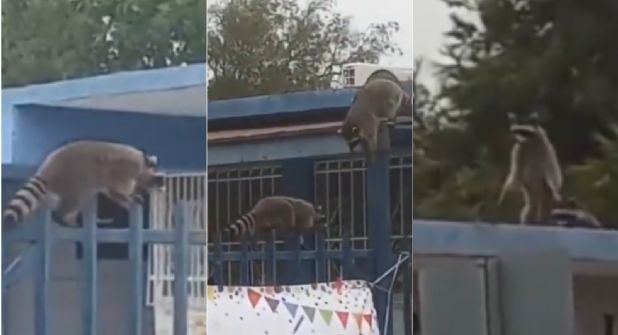 Los mapaches, con toda libertad, se pasean por la escuela primaria, superando cualquier medida de seguridad, como los barrotes del portón. En el clip se puede ver cómo uno de los ejemplares va hacia el resto del grupo e incluso otro le ayuda a subir al techo.