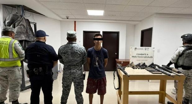 El detenido, identificado con el alias “El Junior”, Alain M. J., conducía un vehículo Lincoln modelo 2011 procedente de El Paso, Texas. Durante la revisión, las autoridades localizaron cuatro armas largas, cuatro armas cortas y una caja de cartón llena de cartuchos para arma larga, además de varios cargadores adicionales.