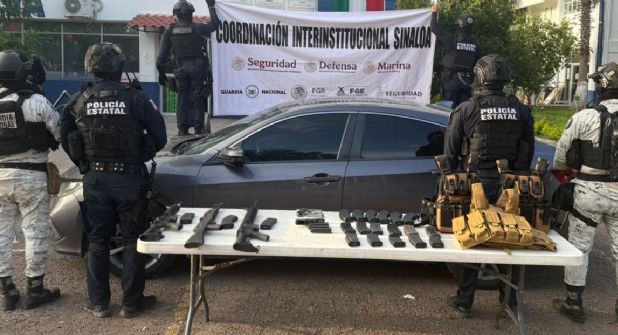 -En Culiacán, en el fraccionamiento Urbivilla del Roble, elementos de GN, Ejército Mexicano, SSPC y Policía Estatal aseguraron tres armas largas, dos armas cortas, 20 cargadores, 579 cartuchos, tres chalecos tácticos, seis placas balísticas y un vehículo.